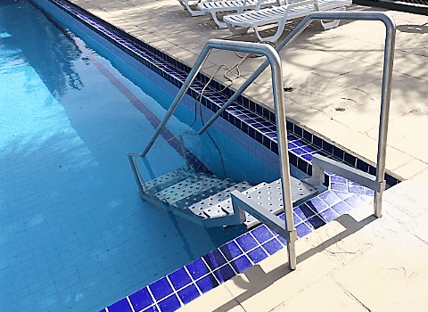Está em processo de instalação uma nova escada na piscina grande. A nova escada é de alumínio, tem 1,50 mt